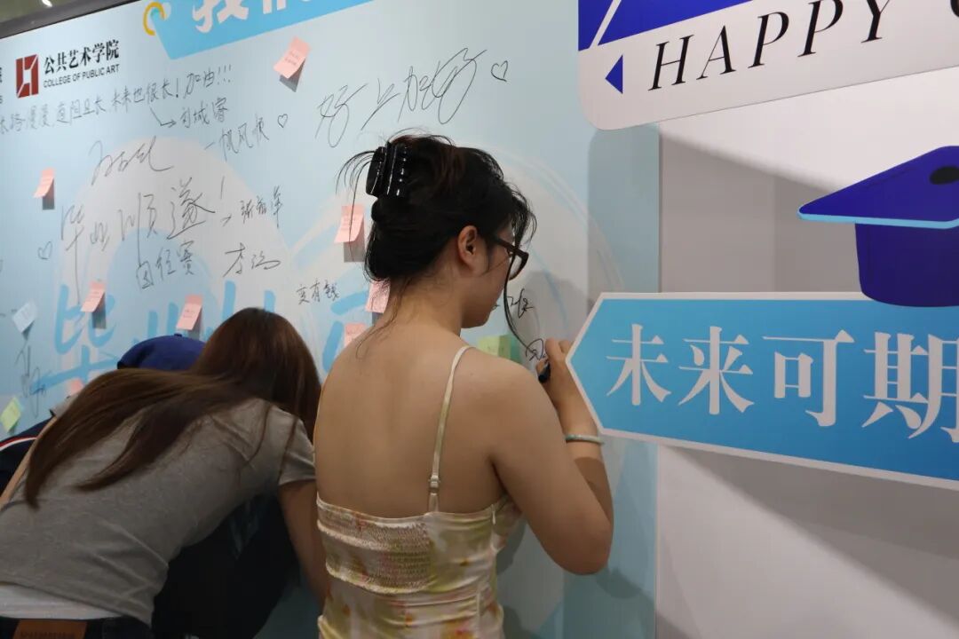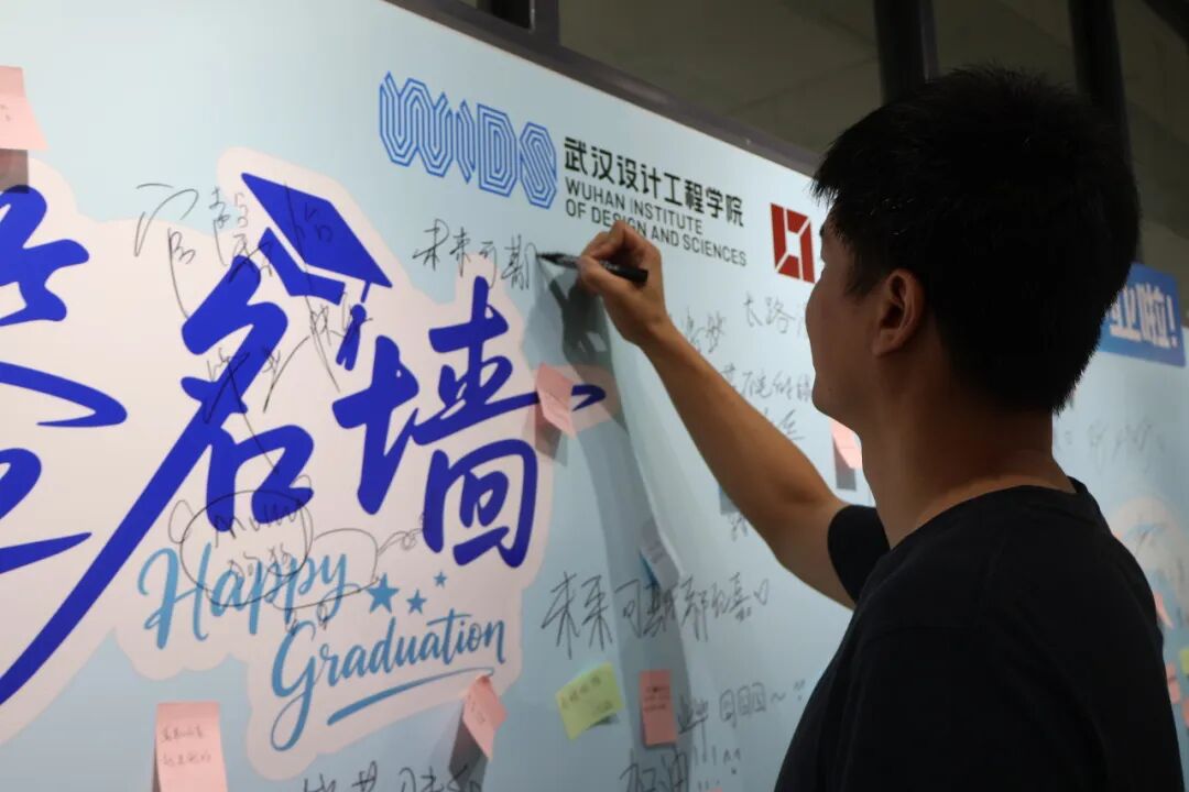 “天天开心”、“万事不愁”……一条条真挚的祝福温暖人心。有人祝愿毕业生无论身在何方,都能保持阳光与豁达,让笑容成为生活最美的底色;也有人寄望他们面对未来挑战时,能够以智慧与从容化解困难,让烦恼如风,生活自在。何高翔书记也在签名墙上写下“未来可期”四字。他说,这不仅是一句美好的期盼,更是对毕业生们实力与潜力的深切认可。