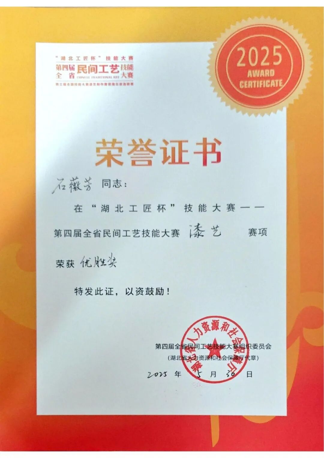 4月24日,经过三日激烈角逐,“湖北工匠杯”技能大赛——第四届全省民间工艺技能大赛在湖北省民间工艺技师学院(长江艺术工程职业学院)圆满落下帷幕。来自全省17个市州的233名民间工艺能工巧匠齐聚一堂,以精湛技艺同台献艺,最终42名佼佼者脱颖而出,获优胜奖殊荣。于日前将证书发至各位获奖选手的手中。
