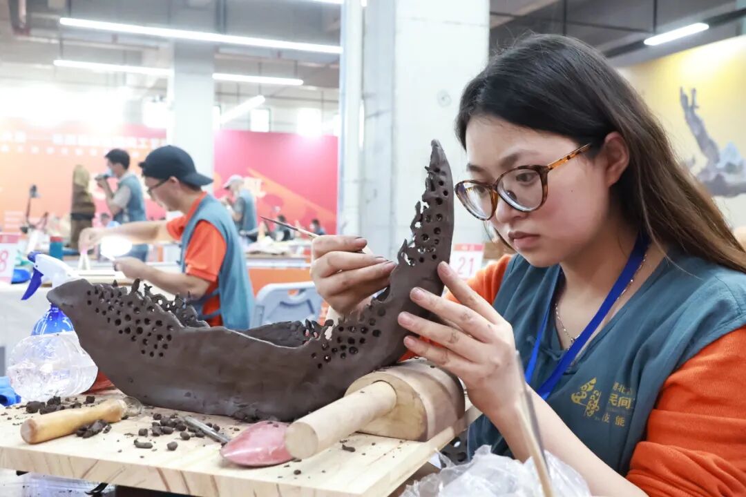 大赛现场堪称一场指尖上的盛宴。无论是刺绣者飞针走线的专注,还是木雕者精雕细琢的沉稳,抑或是陶艺者指尖泥土的灵动,无不彰显荆楚大地深厚的文化底蕴与传承活力。选手们屏息凝神,于方寸之间倾注心力,每一次落笔、每一道刻痕、每一根丝线的穿插,皆是对“匠人精神”最生动的诠释。