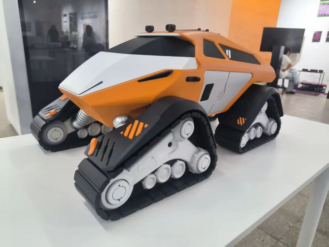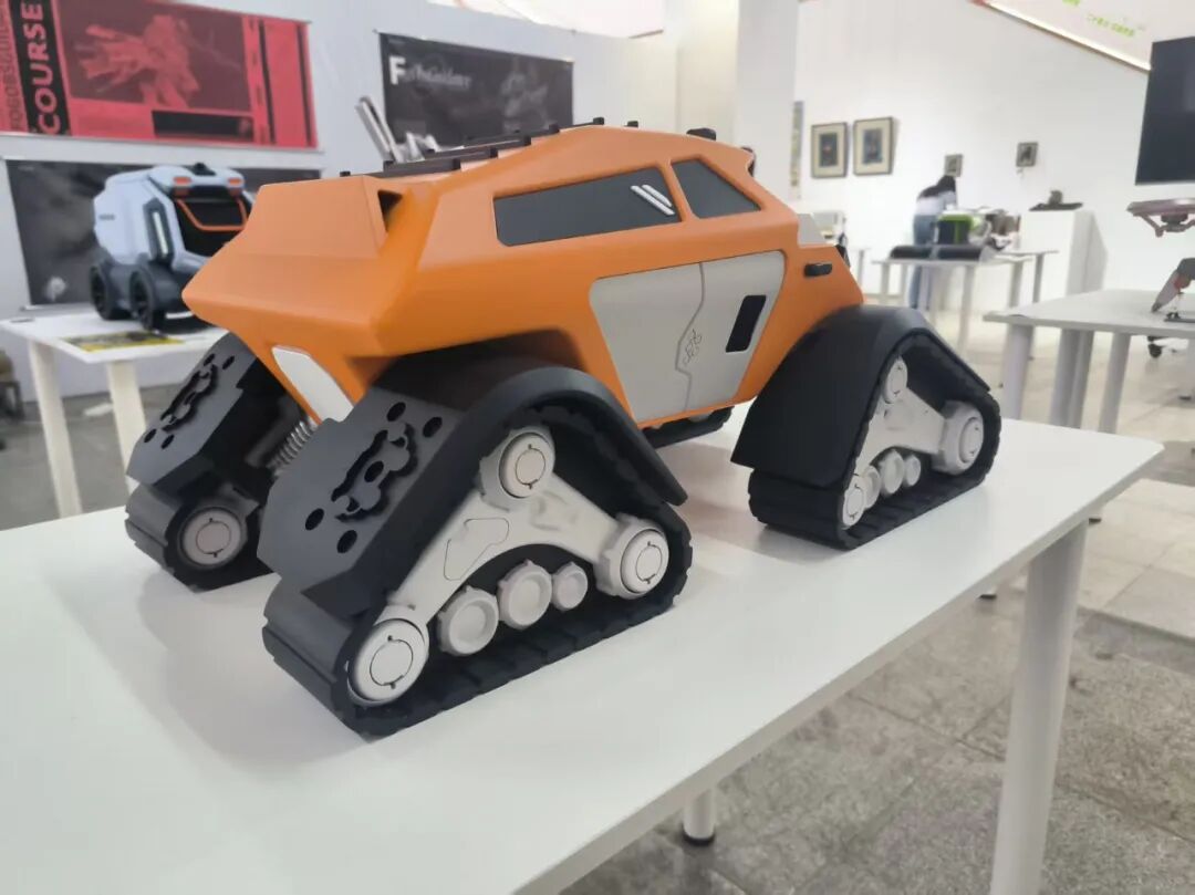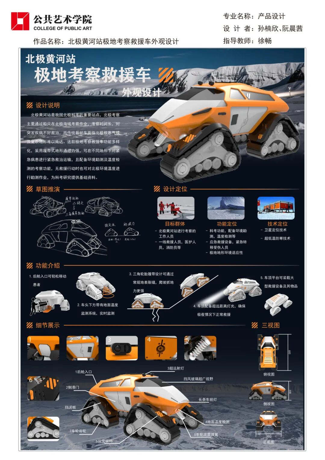 本设计旨在打造一款适用于北极极地环境的考察救援车。外观设计紧扣北极复杂环境与科考救援需求,结构上采用耐低温复合材料与履带式轮胎,确保在极寒、冰雪地形下稳定通行,造型上采用流线型设计,有效降低车辆在极地大风下的风阻,提高车辆效率,外观色彩以橙色为主色调可增强雪地识别性,增强人员安全。同时利用模块化设计集成救援舱与科考设备区,救援转运与环境勘测功能可相互辅助,为北极科考救援提供关键支持。