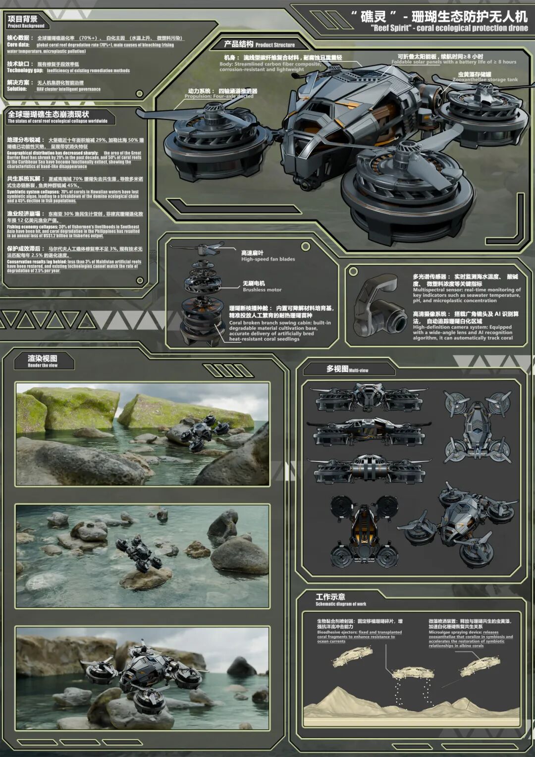 珊瑚生态防护无人机,以应对全球变暖等致珊瑚白化问题。它配备多光谱传感器、高清摄像系统,能监测珊瑚状态,还可投放耐热珊瑚苗、喷洒共生虫黄藻,助力珊瑚生态修复。