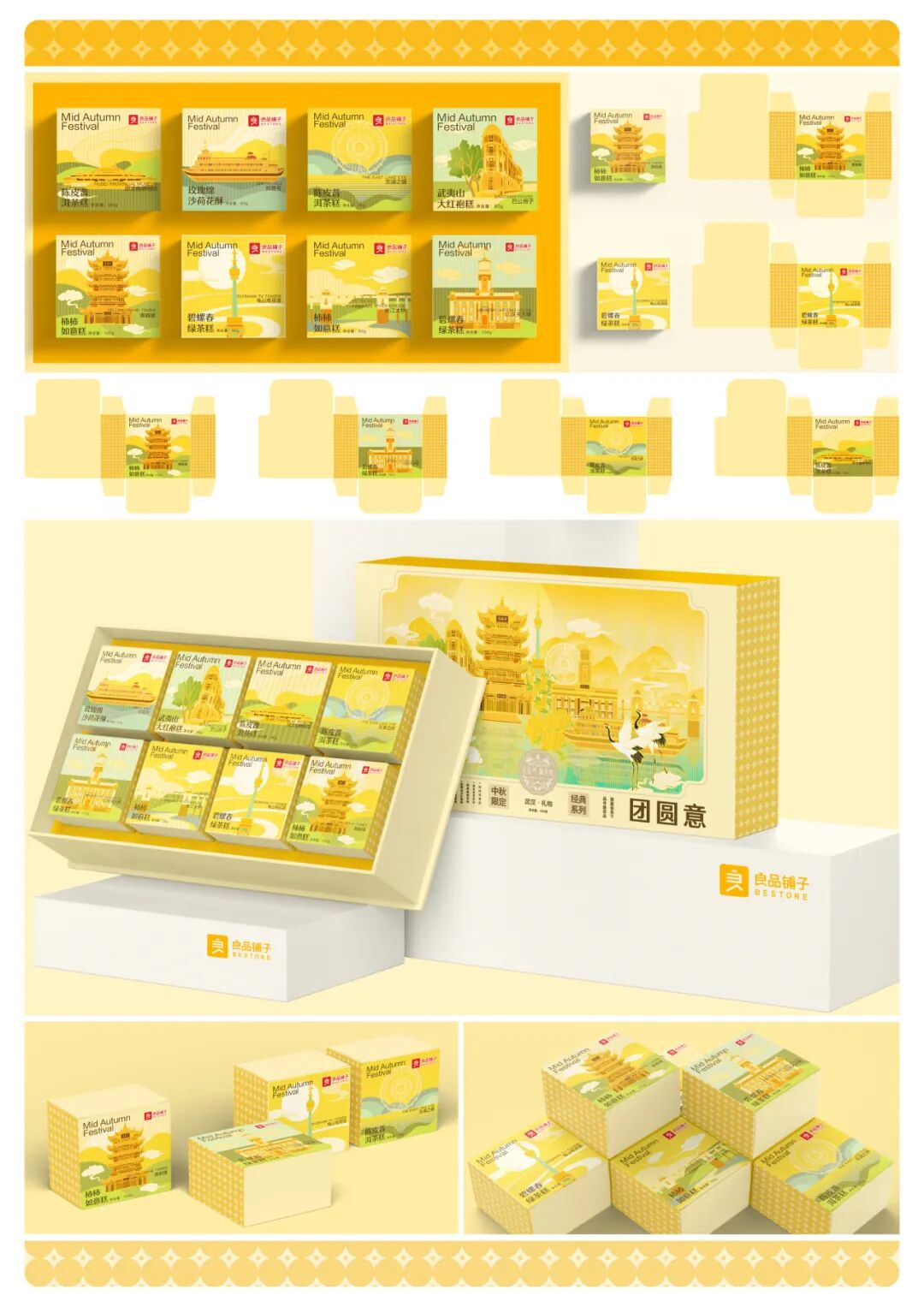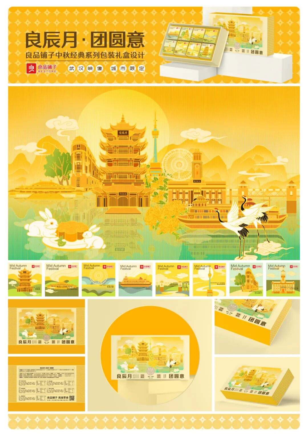 本次良品铺子中秋礼盒以武汉地标为核心元素,打造“武汉礼物”概念,融合玉兔、明月与桂花等中秋意象,以年轻化的国潮插画风格呈现,层次丰富、构图清晰。主色调选用暖黄调,呼应传统月饼质感,传递温暖节日氛围,既彰显地域文化内涵,也增强产品的情感吸引力与品牌价值。