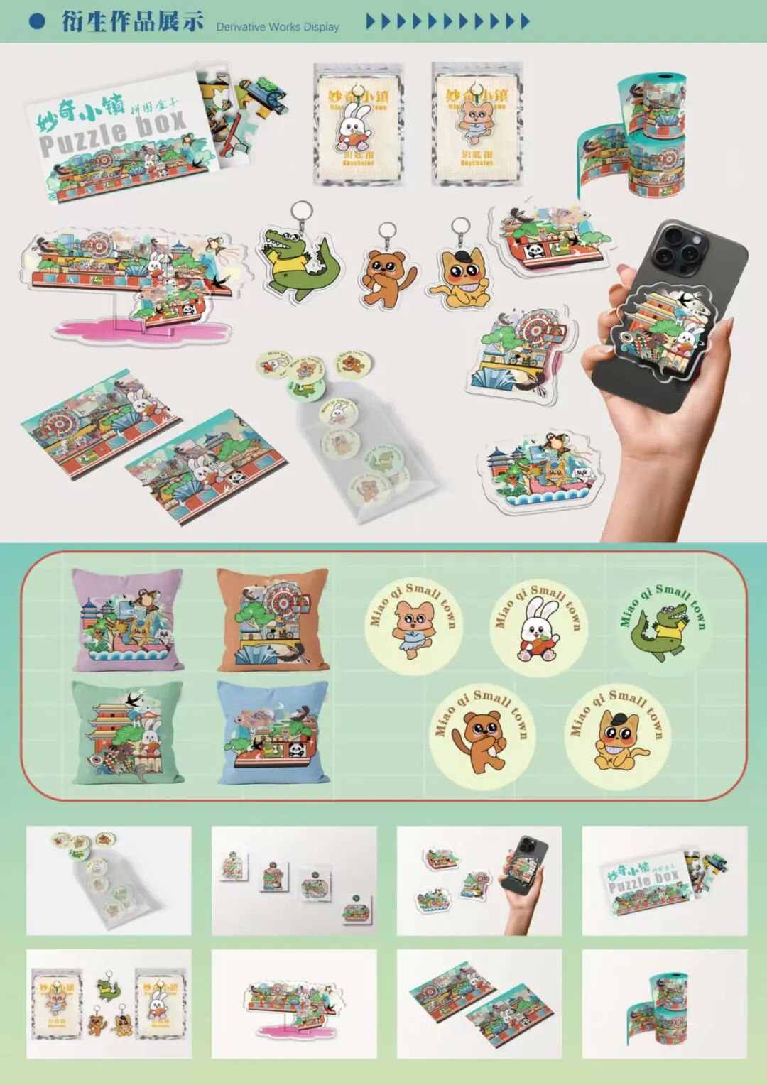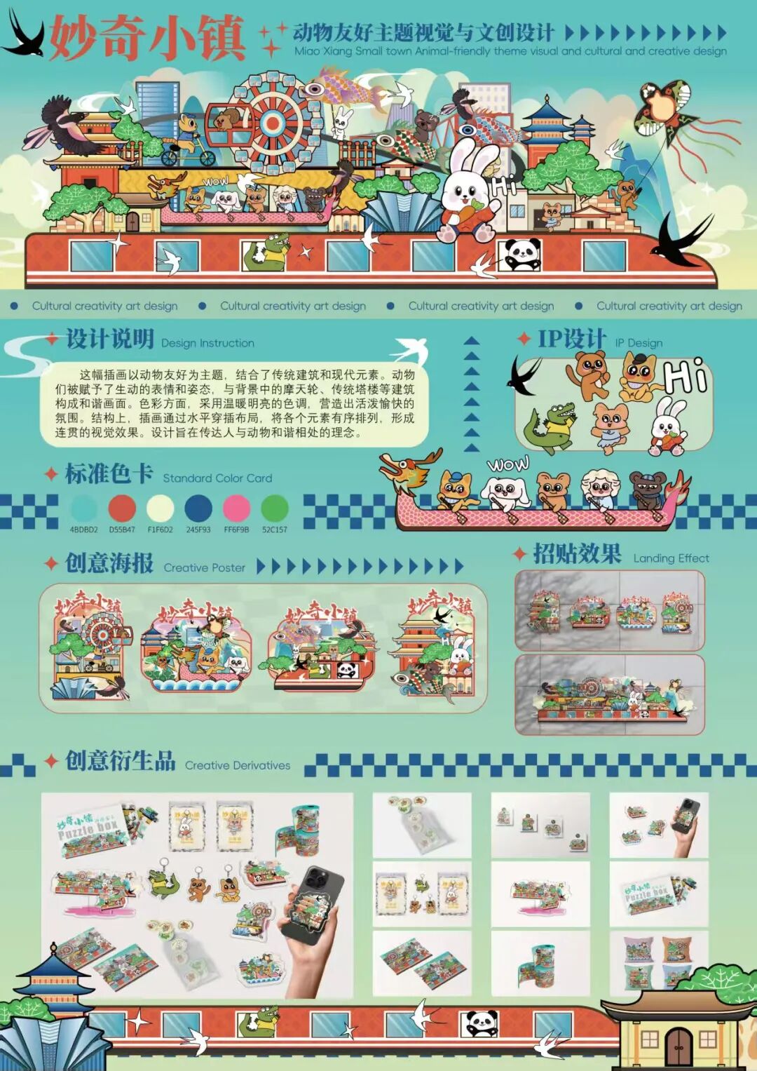 “妙想小镇”动物主题文创设计,以活泼可爱的动物形象为主角,构建了一个充满欢乐与惊喜的小镇世界。设计中融入了中国风元素,如传统建筑、风筝、鱼灯等元素,展现了浓厚的文化底蕴。动物们在小镇中自由生活,有的在屋顶上玩耍,有的在街道上漫步,营造出一种和谐美好的氛围。通过这些生动的动物形象和场景,我们传递出动物友好的理念,同时激发人们对传统文化的兴趣和热爱。
